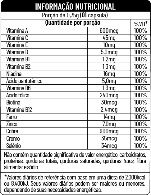 Óleo de soja, maltodextrina, ácido ascórbico, nicotinamida, fumarato ferroso, DL alfa tocoferol, óxido de zinco, pantotenato de cálcio, riboflavina, cloridrato de piridoxina, nitrato de tiamina, sulfato de cúprico, acetato de retinol, ácido fólico, cloreto crômico, selenato de sódio, D- biotina, colecalciferol, cianocobalamina e emulsificante lecitina de soja. Composição da cápsula: gelatina, água purificada, umectante glicerina, glaceante cera de abelha e corantes dióxido de titânio, vermelho azorrubina, vermelho Bordeaux S., óxido de ferro preto e azul brilhante. NÃO CONTÉM GLÚTEN. ALÉRGICOS: CONTÉM DERIVADOS DE SOJA.