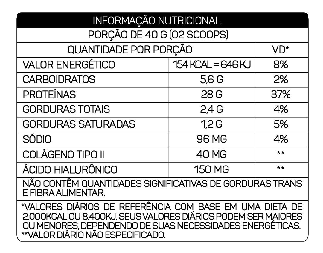 Proteína concentrada de soro do leite, hialuronato de sódio (ácido hialurônico), colágeno tipo II não desnaturado, cacau, antiumectante dióxido de silício, edulcorantes estévia e taumatina. NÃO CONTÉM GLÚTEN. CONTÉM LACTOSE. ALÉRGICOS: CONTÉM DERIVADOS DE LEITE.