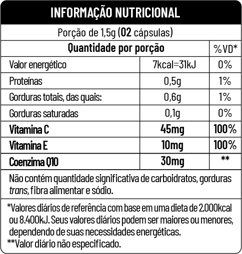 A Coenzima Q10 + Colágeno + Vitaminas é uma combinação poderosa de nutrientes que ajudam a melhorar a produção de energia celular no organismo e combatem os radicais livres. A Coenzima Q10 + Colágeno + Vitaminas é ideal para aqueles que procuram melhorar a saúde em geral além de aumentar a energia e melhorar a função celular.